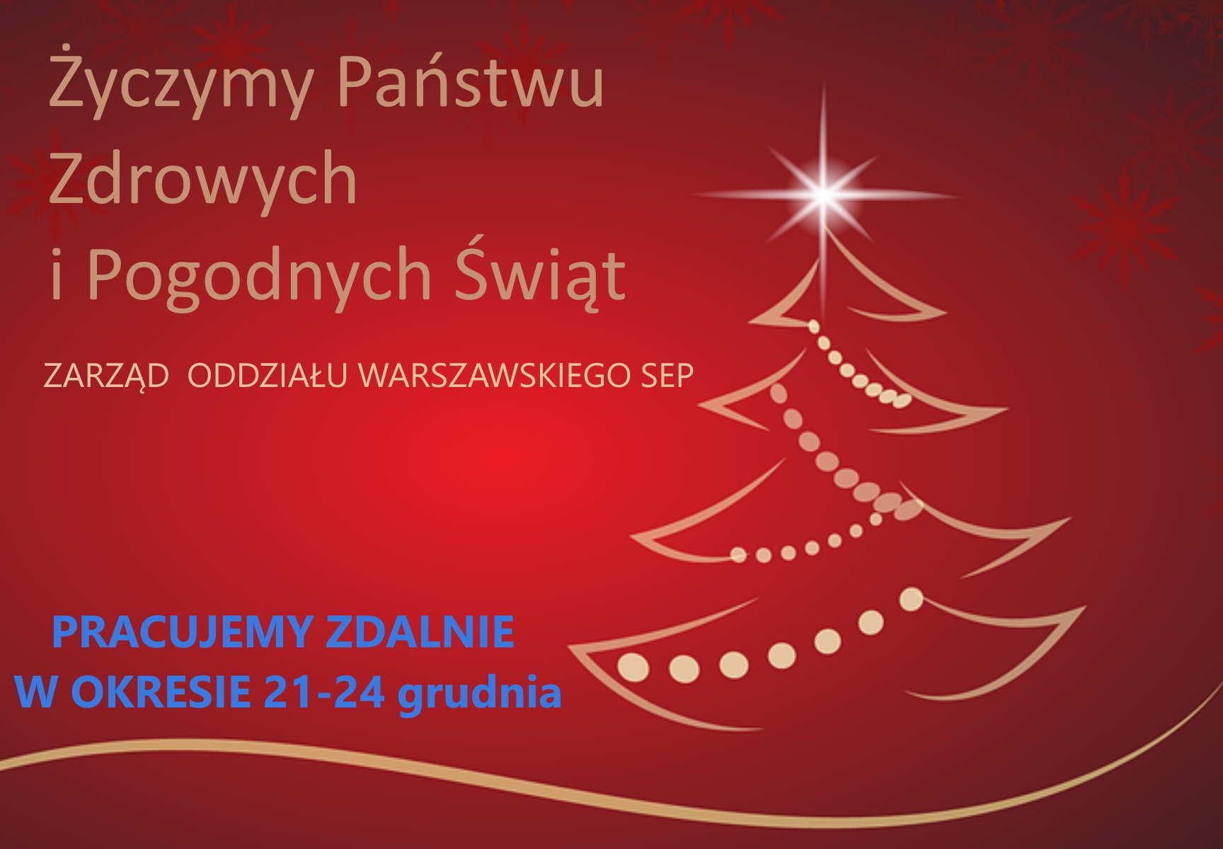 Serdeczne życzenia z okazji Bożego Narodzenia, dużo zdrowia, radości i pomyślności. W dniach 21-24.12 biuro pracuje zdalnie. Prosimy o kontakt emailowy.