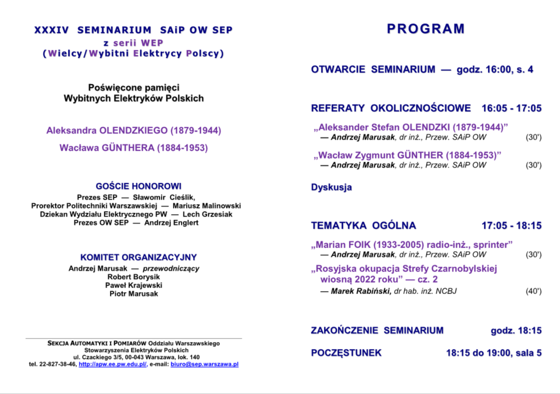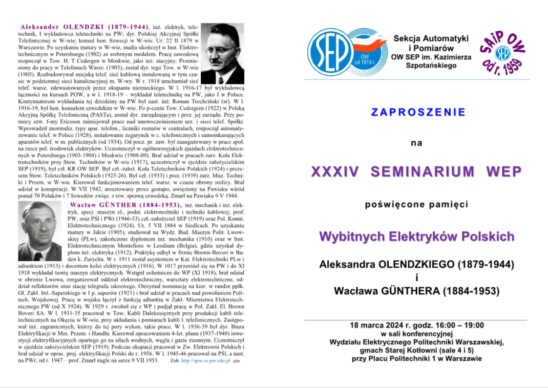Zapraszamy Państwa do wzięcia udziału w kolejnym seminarium, XXXIV WEP _ 18 marca 2024 r. w godz. 16:00 - 19:00, Sale 4/5 Stara Kotłownia na Politechnice Warszawskiej. Prosimy również o rozpowszechnienie tego zaproszenia wśród swoich kolegów i znajomych zainteresowanych tematyką, ponieważ Seminarium jest otwarte.