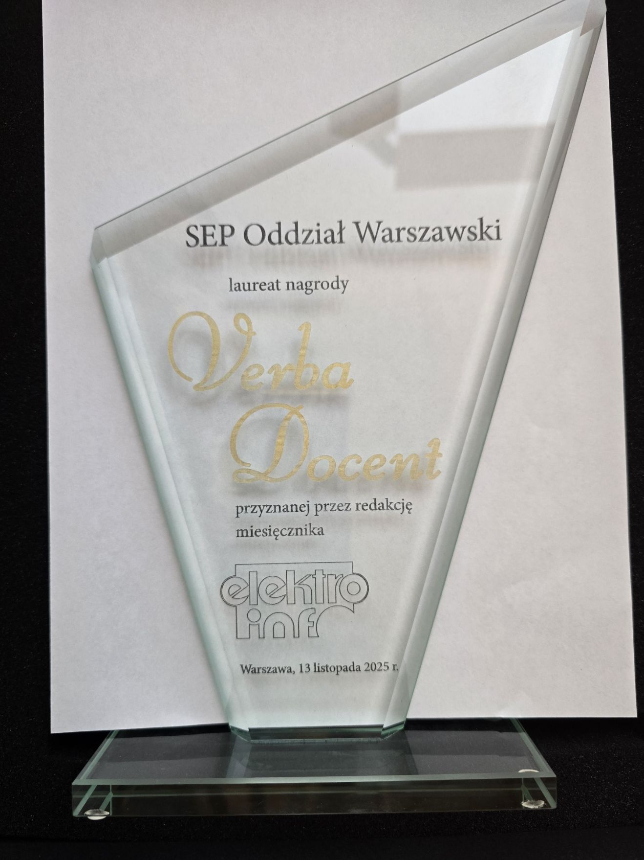 Prezes Oddziału Warszawskiego Stowarzyszenia Elektryków Polskich, Andrzej Englert, odebrał z rąk redaktora naczelnego czasopisma, Pana Juliana Wiatra, prestiżową nagrodę VERBA DOCENT 2025.