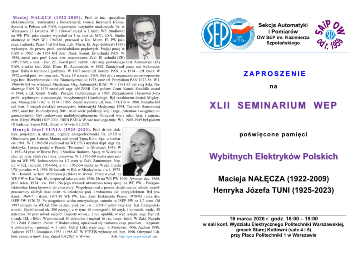 Zapraszamy Państwa do wzięcia udziału w kolejnym seminarium z serii Wielcy/Wybitni Elektrycy Polscy, XLII-WEP , 16 marca 2026 r. w godz. 16:00 - 19:00, Sale 4/5 Stara Kotłownia na Politechnice Warszawskiej.