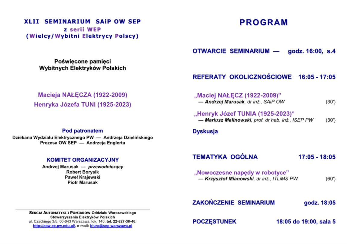 Zapraszamy Państwa do wzięcia udziału w kolejnym seminarium z serii Wielcy/Wybitni Elektrycy Polscy, XLII-WEP , 16 marca 2026 r. w godz. 16:00 - 19:00, Sale 4/5 Stara Kotłownia na Politechnice Warszawskiej.